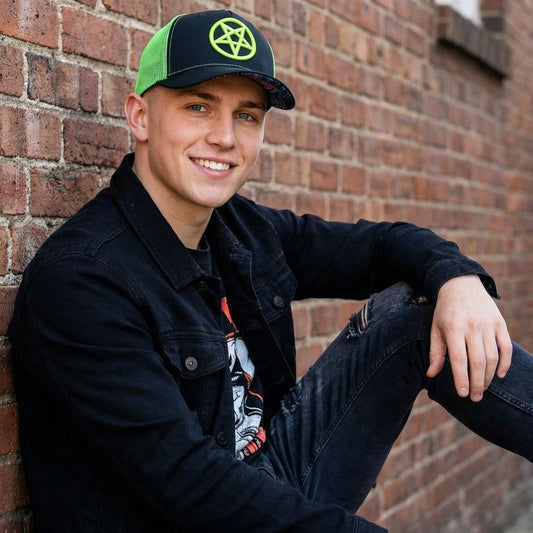1. Neon Trucker Cap: The most common variant with a 6-panel crown, featuring a pentagram embroidered front panel that stands up straight.