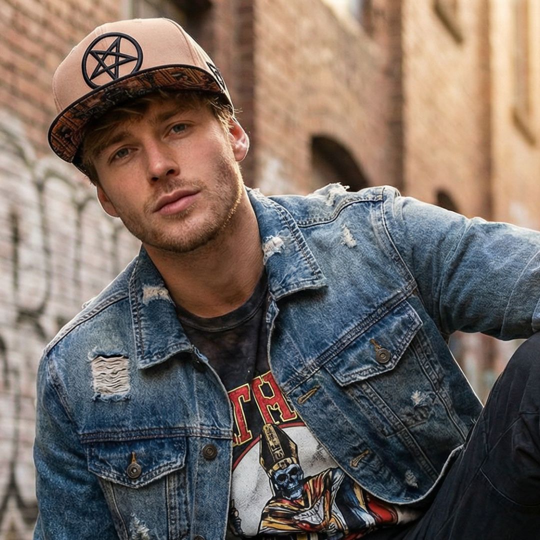 Cursed Priest is a light brown snapback with a black brim. The front logo is a black pentagram. The left side of the snapback is embroidered with the traditional logo of Capiche and the back side is embroidered with “Capiche”. The embroideries are in black. The brim bottom is covered with the Cursed Priest design. Cursed Priest snapback is part of the cursed collection.