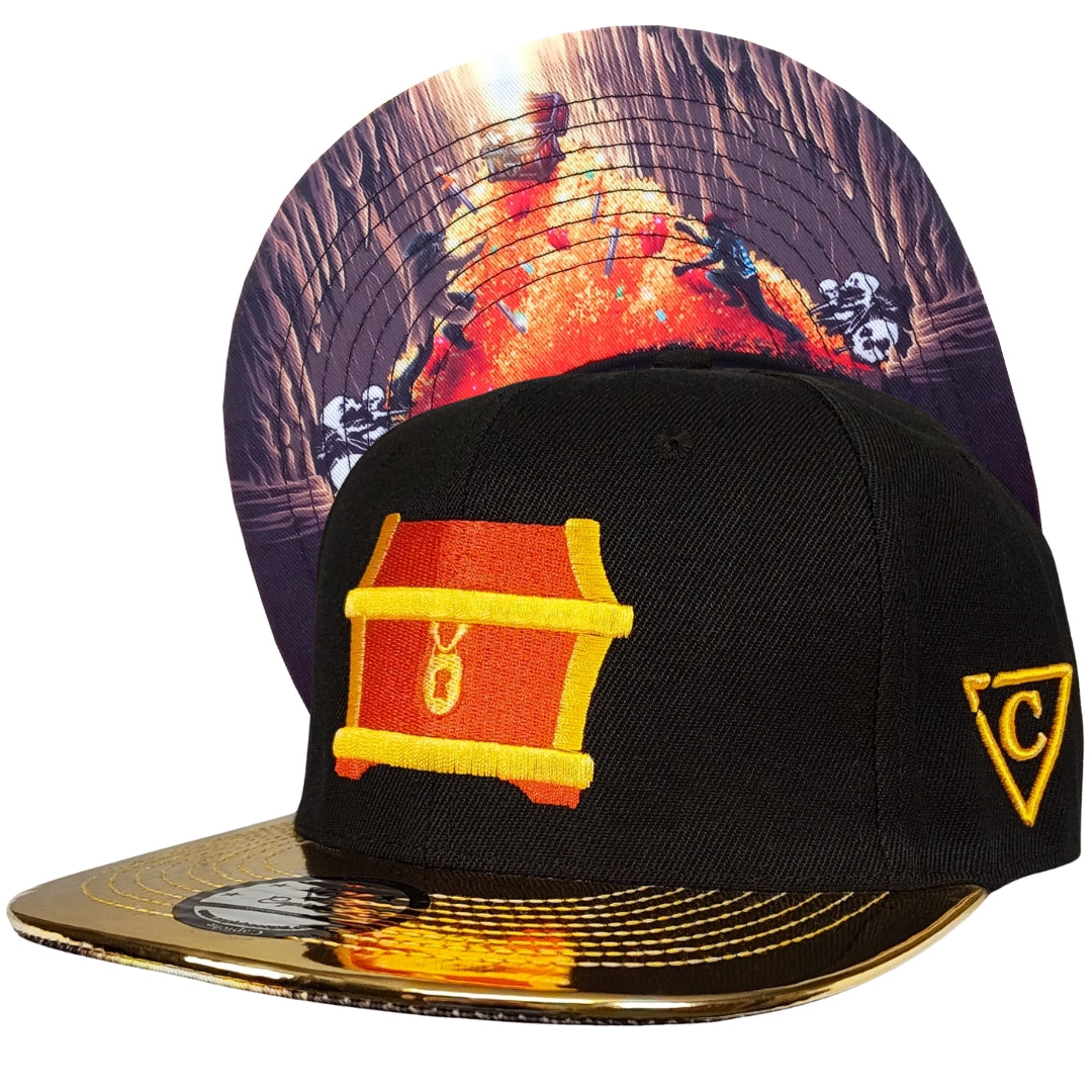Go For Gold is a black snapback with a golden metallic brim. The front logo is the hidden treasure. The left side of the snapback is embroidered with the traditional ‘C’ logo of Capiche, the right side is embroidered with the pirate collection logo, and the back side is embroidered with ‘Capiche’. The embroideries are in warm yellow.