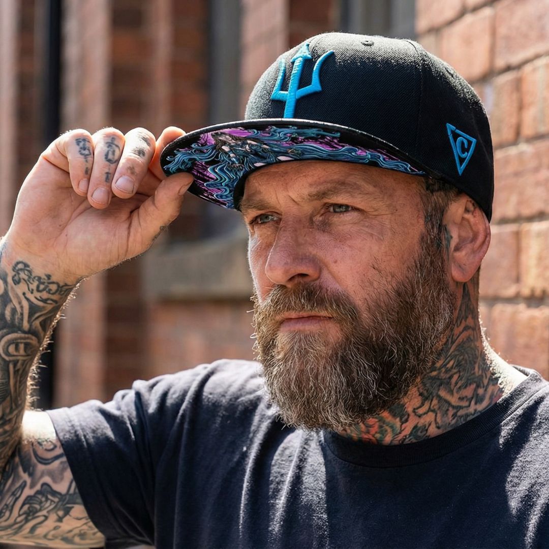 Nyx is a black snapback with a black faux leather brim. The front logo is a blue trident. The left side of the snapback is embroidered with the traditional logo of Capiche and the back side is embroidered with “Capiche”. The embroideries are in blue. The brim bottom is covered with the Nyx design. Nyx snapback is part of the Ancient Greek Collection.