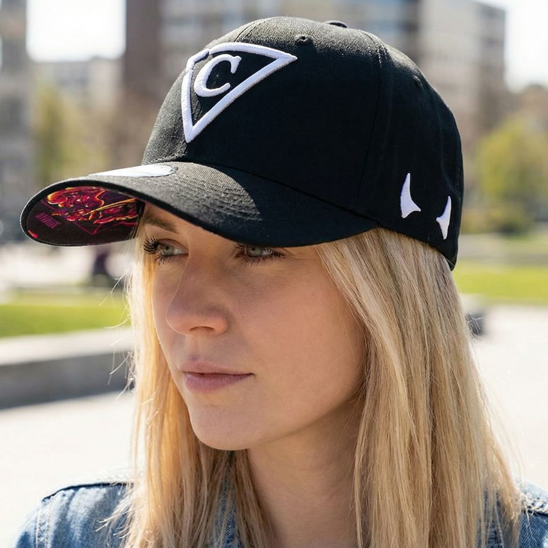 Red Devil is a black curved baseball cap with a black brim. The front logo is a white Capiche logo. The back side of the baseball cap is embroidered with “Capiche”. On the bottom of the baseball cap is the red devil design. Red Devil is part of the Devil collection.