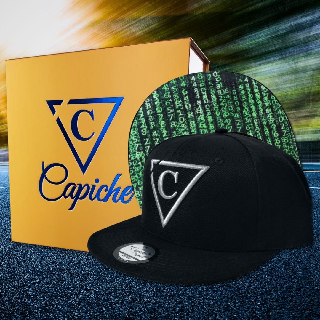 The Hacker is a black snapback with a black brim. The front logo is a grey Capiche logo. The back side of the snapback is embroidered with “Capiche”. The embroideries are in grey. The brim bottom is covered with the The Hacker design.
